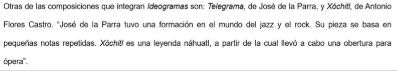Otra de las composiciones que integran ideogramas son: Telegrama, de José de la Pima, y Xéchil, de Antonio Flores Castro.